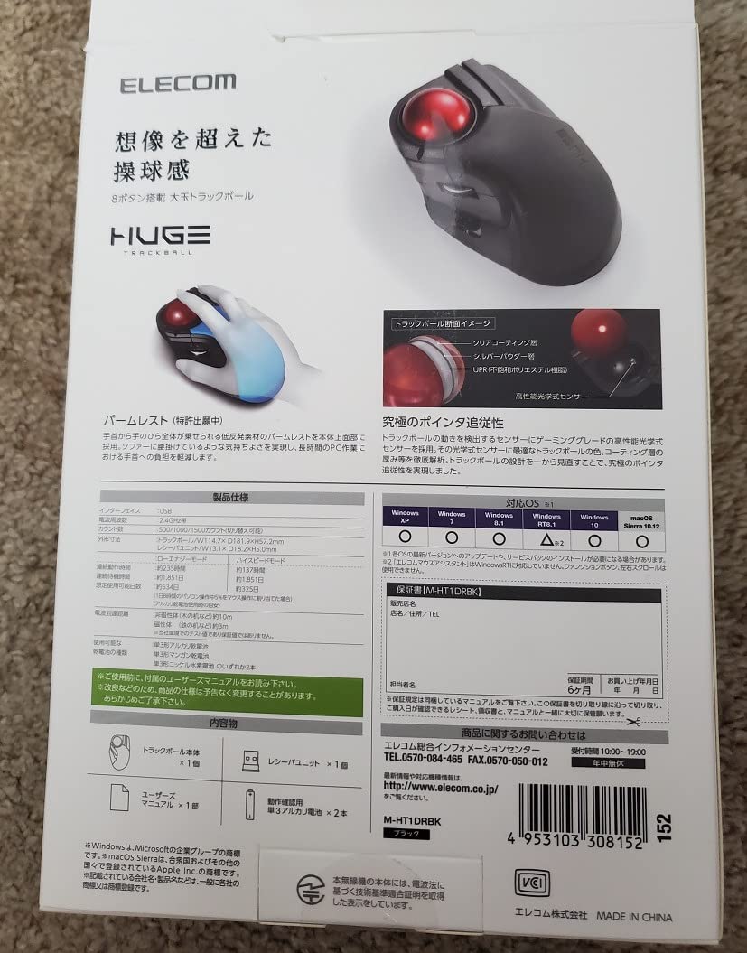 ماوس بی‌سیم ۲.۴ گیگاهرتز، USB، کنترل با انگشت اشاره، ۸ دکمه قابل تنظیم، گوی ELECOM HUGE زیردستی نرم و بزرگ، گوی ۵۲ میلی‌متری، ویندوز، مک (M-HT1DRBK)