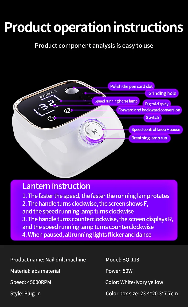 چندکاربردی برای تمام مراحل خدمات ناخن ساختار فنی دستگاه بهگونهای طراحی شده که تمام نیازهای یک تکنسین حرفهای را پوشش دهد: برداشت ژل و اکریلیک، یکدستسازی سطح، مانیکور روسی، صیقل نهایی و حتی کارهای ظریف طراحی. این تنوع عملکرد، BQ‑113 را به یک ابزار «All‑in‑One» واقعی تبدیل میکند.