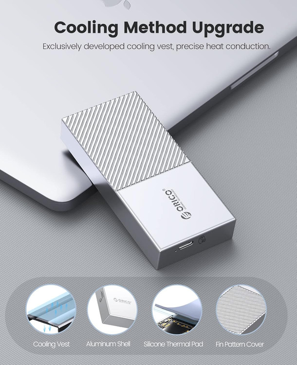 جلیقه خنککننده فلزی اختصاصی ORICO همراه با پد حرارتی سیلیکونی بلند، پوشش کامل SSD را فراهم میکند.