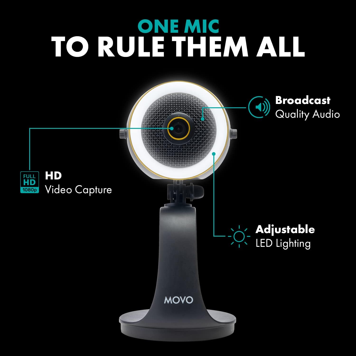 وب‌کم همه‌کاره Movo WebMic HD Pro با میکروفون کندانسور و چراغ حلقه‌ای - دوربین HD 1080p