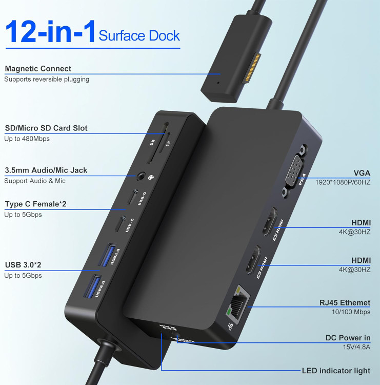 داک استیشن سرفیس با سه نمایشگر 4K و دو خروجی HDMI+VGA، داک 12 کاره سرفیس برای سرفیس پرو 11/10/9/8/X/7+/7/6/5/4/3، سرفیس لپتاپ 7/6/5/4/3/2/1، داک سرفیس گو/بوک