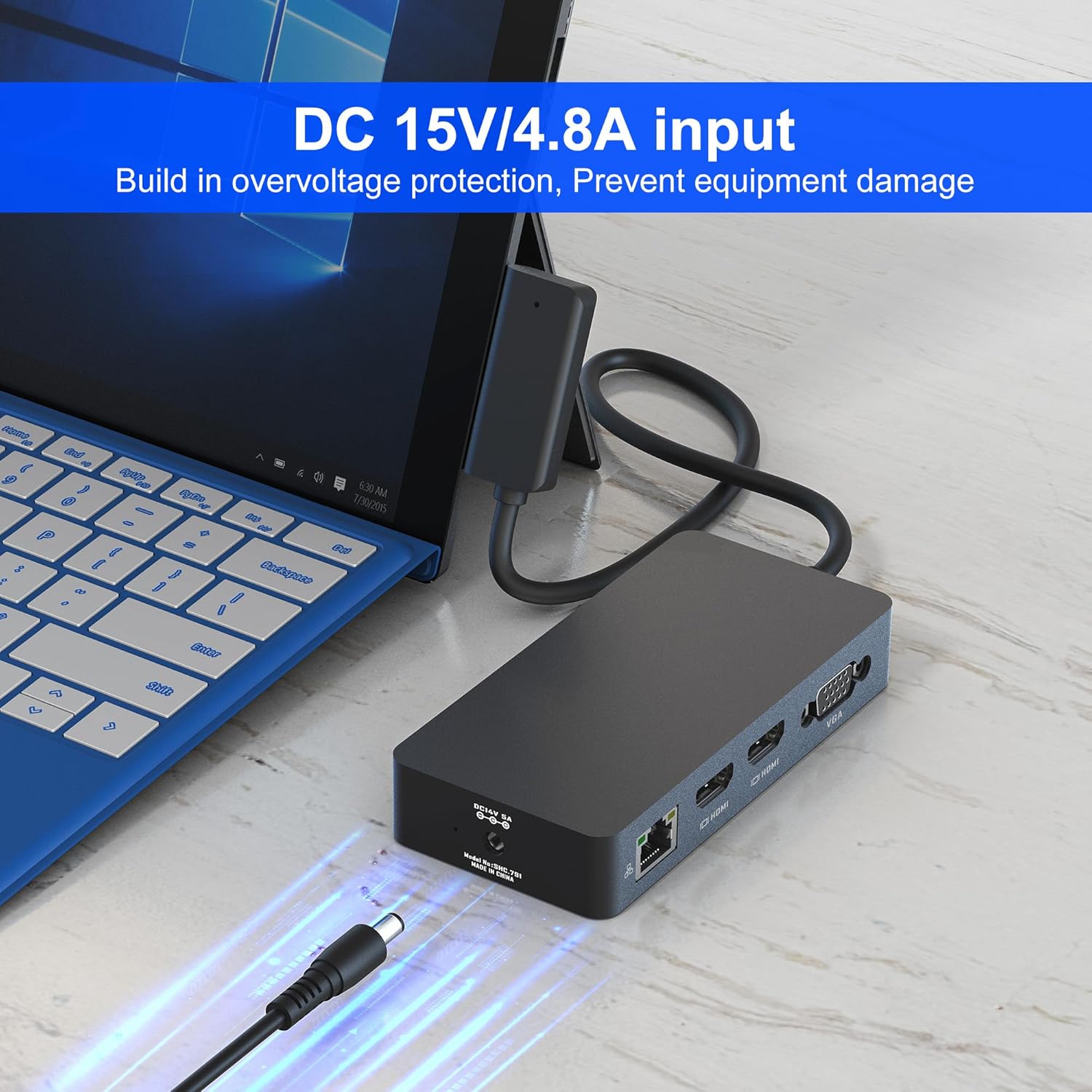 این داک مجهز به پورت RJ45 اترنت با سرعت ۱۰/۱۰۰ مگابیت بر ثانیه برای اتصال پایدار شبکه، اسلات کارت SD/TF با سرعت خواندن تا ۱۰۴ مگابایت بر ثانیه و جک صوتی ۳.۵ میلیمتری برای هدفونهای سیمی است. طراحی مینیمالیستی و شیک آن همراه با ورودی برق DC اختصاصی (۱۵V/4.8A) شارژ سریع تا ۷۲ وات را تضمین میکند. کانکتور مغناطیسی ارتقا یافته نیز اتصال دوطرفه ایمن و سریع را نسبت به مدلهای قبلی فراهم کرده است.