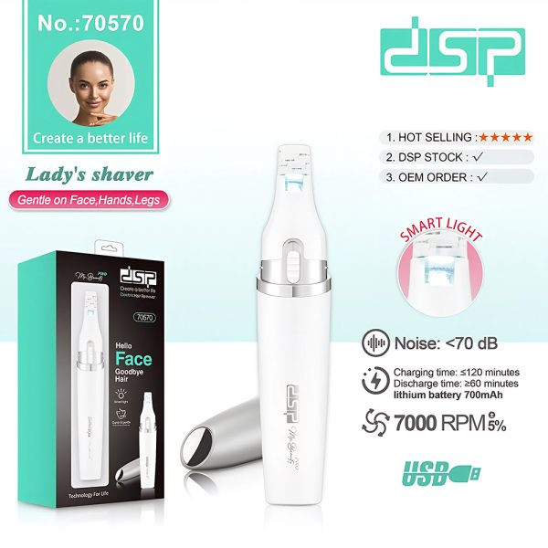 DSP یک برند معتبر در زمینه لوازم الکترونیکی مراقبت شخصی است که به دلیل تولید محصولات با کیفیت بالا، کاربردی و مقرون به صرفه که در سراسر جهان محبوبیت پیدا کردهاند، شناخته شده است. مدل DSP ۷۰۵۷۰ یک ریشتراش زنانه چند منظوره است که برای از بین بردن موهای صورت، دستها و پاها طراحی شده است. این ریشتراش جایگزین بسیار خوبی برای روشهای سنتی و اغلب دردناک مانند بند انداختن یا اپیلاسیون است.